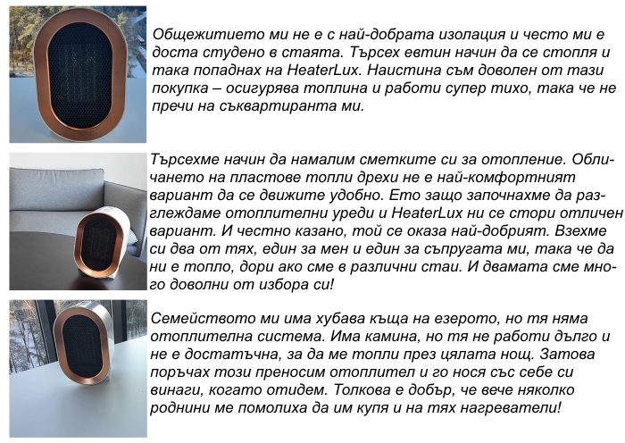 HeaterLux е преносим отоплител. Той ефективно загрява въздуха около вас, тих е като шепот, не заема почти никакво място и е леснопреносим. Вземете отоплител, който ще ви осигури топлина там, където имате нужда, и ще ви помогне да задържите част от парите за отопление за себе си.