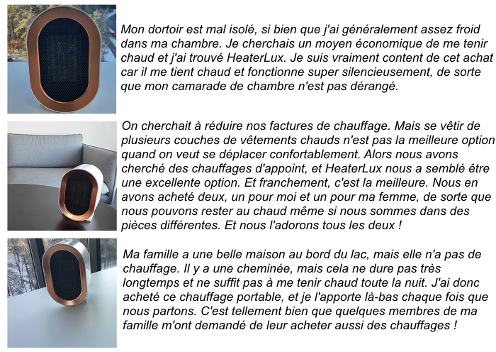 HeaterLux est une façon efficace et abordable de réchauffer la pièce qui vous entoure, où que vous alliez. Il possède tout ce qu’un appareil de chauffage fiable devrait avoir : des matériaux ignifuges de qualité, une protection contre la surchauffe et un arrêt automatique en cas de renversement. Il diffuse la chaleur de manière large, uniforme et sans fluctuations de température, et malgré sa petite taille, il est puissant. Comme il est si petit et léger, le HeaterLux peut être facilement transporté d’un endroit à l’autre, posé sur le sol, le bureau ou la table de chevet, ce qui vous permet d’avoir une source de chaleur dans presque toutes les circonstances. Mais l’aspect le plus séduisant de ce chauffage d’appoint portable est son rapport qualité-prix ! Non seulement vous bénéficiez de toutes ces caractéristiques fantastiques pour un prix très avantageux, mais HeaterLux vous aidera également à économiser sur les factures à l’avenir.