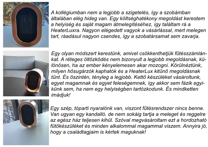 A HeaterLux hatékony és megfizethető megoldás, hiszen bárhova magával viheti és felmelegítheti vele környezetét. A készülékben minden megtalálható, amivel egy megbízható fűtőberendezésnek rendelkeznie kell: minőségi tűzálló anyagok, túlmelegedés elleni védelem és automatikus lekapcsolási funkció felborulás esetére. Kis mérete ellenére a meleg levegőt széles szögben, egyenletesen és hőmérséklet-ingadozás nélkül bocsátja ki, ráadásul rendkívül hatékony. Kis méretének és súlyának köszönhetően a HeaterLux készülék könnyedén áthelyezhető egyik helyről a másikra. Használhatja padlón, íróasztalon, vagy akár éjjelszekrényen is, egész biztos, hogy környezetét minden körülmény között fel fogja melegíteni. Viszont ennek a hordozható hősugárzónak a legvonzóbb tulajdonsága a kiváló ár-érték arány! Nem elég, hogy ezek a fantasztikus funkciók mind elérhetők egy rendkívül barátságos áron, de a HeaterLux készülékkel a későbbi számláin is spórolhat.