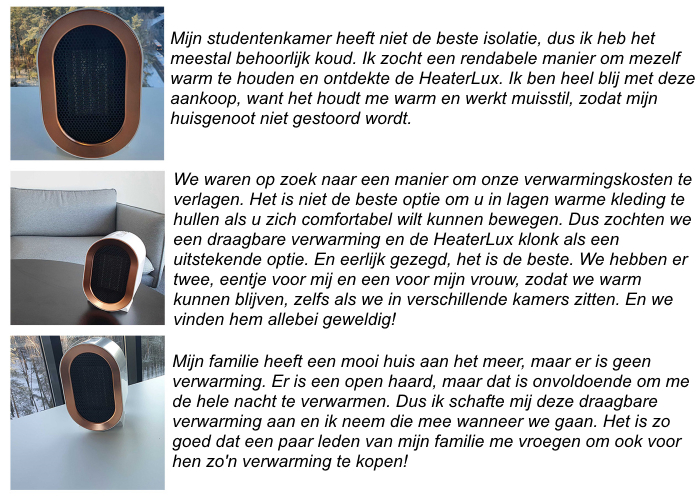 De HeaterLux is een draagbare verwarming. Het verwarmt doeltreffend de lucht om u heen, is muisstil, neemt nauwelijks plaats in en is gemakkelijk draagbaar. Koop een verwarming die u warm houdt waar het nodig is en die u helpt om wat geld te besparen voor leukere dingen.