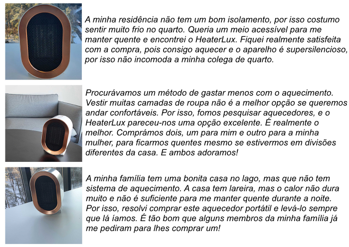 O HeaterLux é um aquecedor portátil. Aquece com eficiência o ar à sua volta, é silencioso, praticamente não ocupa espaço e é fácil de transportar. Compre um aquecedor para se aquecer onde quer que esteja e que o ajudará a cortar gastos com o aquecimento.