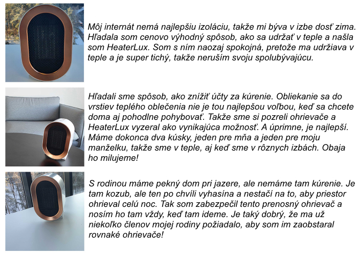 HeaterLux je efektívne a cenovo dostupné riešenie, ako vyhriať priestor okolo vás, bez ohľadu na to, kde sa nachádzate. Má všetko, čo má spoľahlivý ohrievač mať: kvalitné ohňovzdorné materiály, funkciu automatického vypnutia pri prevrátení a ochranu voči prehriatiu. Teplo rozvádza pod širokým uhlom, rovnomerne a bez výkyvov. Napriek malým rozmerom je veľmi výkonný. Keďže je HeaterLux malý a ľahký, môžete ho jednoducho prenášať, položiť na podlahu, stôl alebo nočný stolík, čím zaistíte, že budete mať zdroj tepla za takmer každých okolností. Ale najlákavejšia vec na tomto prenosnom ohrievači je pomer ceny a kvality! Nielenže získate všetky tieto fantastické funkcie za veľmi výhodnú cenu, ale HeaterLux vám aj pomôže ušetriť na účtoch za kúrenie.