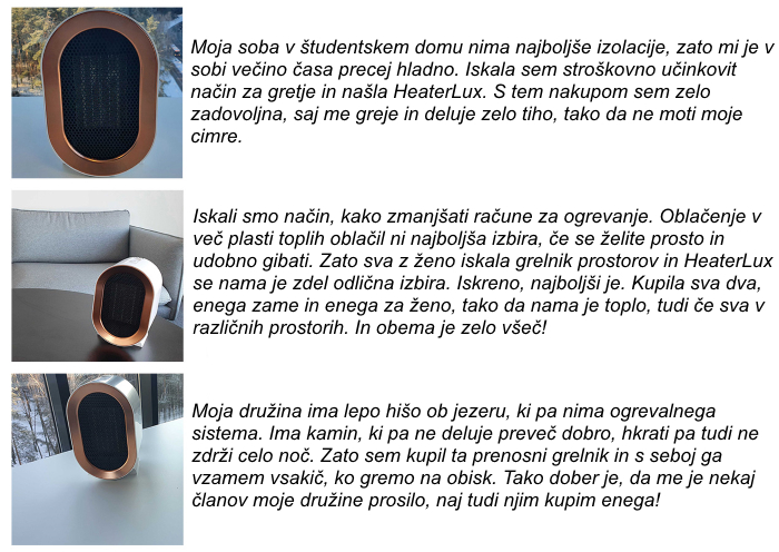 HeaterLux je prenosni grelnik prostorov. Učinkovito segreva zrak okoli vas, je izjemno tih, ne zavzame skoraj nič prostora in je lahko prenosljiv. Kupite grelnik prostorov, ki vas bo grel, kjer koli ga boste potrebovali, hkrati pa vam bo pomagal prihraniti tudi nekaj denarja za ogrevanje.